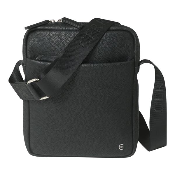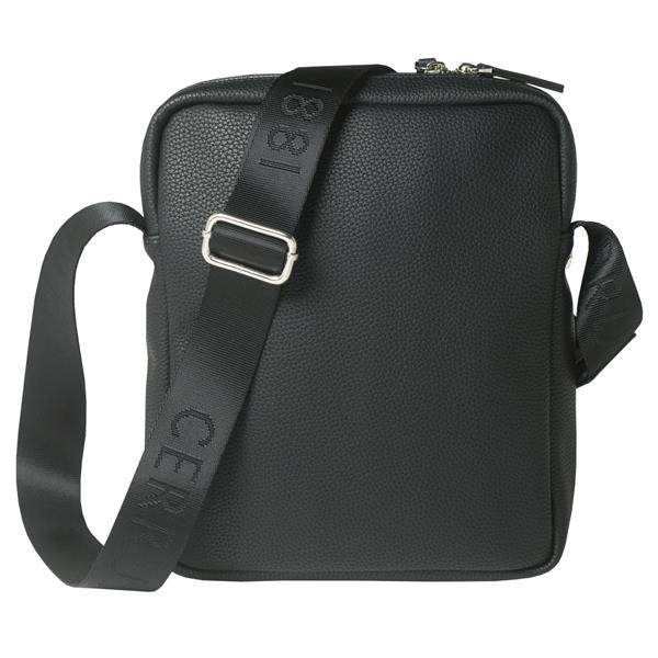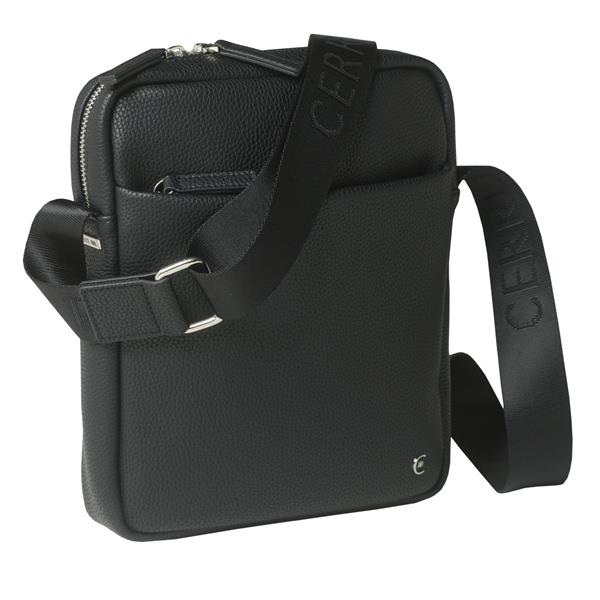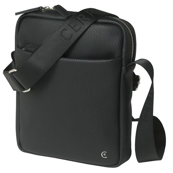 Torba reporterska Hamilton firmy Cerruti 1881 wykonana jest z bardzo miękkiej, ziarnistej czarnej skóry imitującej skórę. Podpis Cerruti 1881 jest zapleciony w zdejmowany pasek i wytłoczony na błyszczącej chromowanej metalowej płycie delikatnie umieszczonej z boku torby. Dyskretna, ale luksusowa błyszcząca, chromowana blacha CRR znajduje się również z przodu tego artykułu.