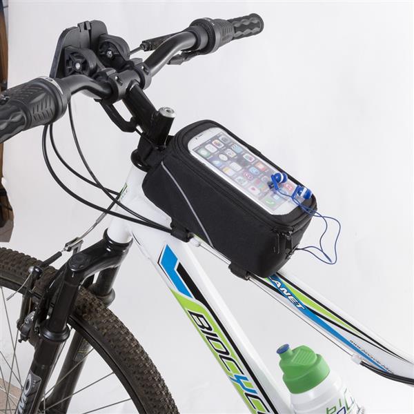 Torba rowerowa, przegroda główna zamykana na zamek błyskawiczny, kieszeń na telefon z transparentnym okienkiem umożliwiającym obsługę ekranów dotykowych, wyjście na słuchawki