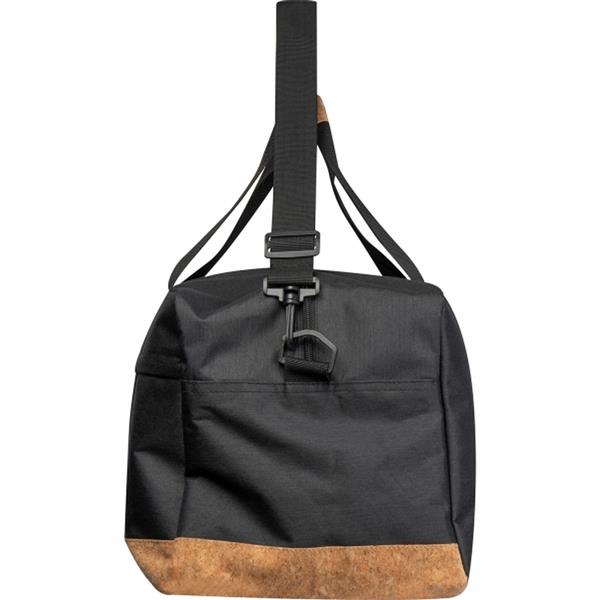Torba sportowa wykonana z materiału RPET, z korkowym dnem. Torba posiada dużą komorę zamykaną na zamek oraz mniejszą, frontową kieszeń, dwa krótkie uchwyty i długi, odpinany pasek na ramię.
