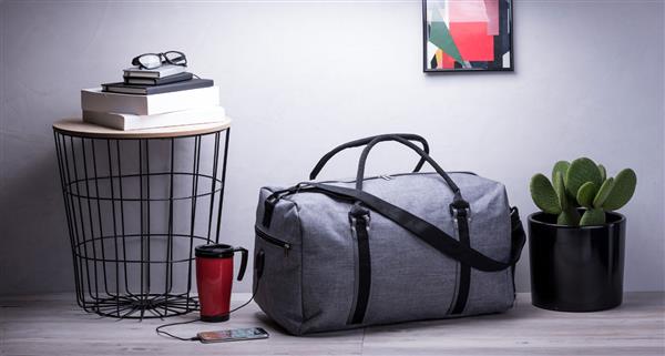 Torba sportowa z komorą zamykaną na suwak, z paskiem na ramię i wbudowanym złączem USB do ładowania telefonów. Poliester 600D.