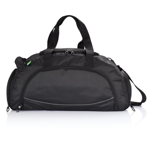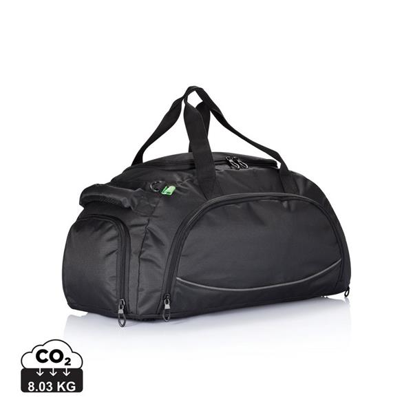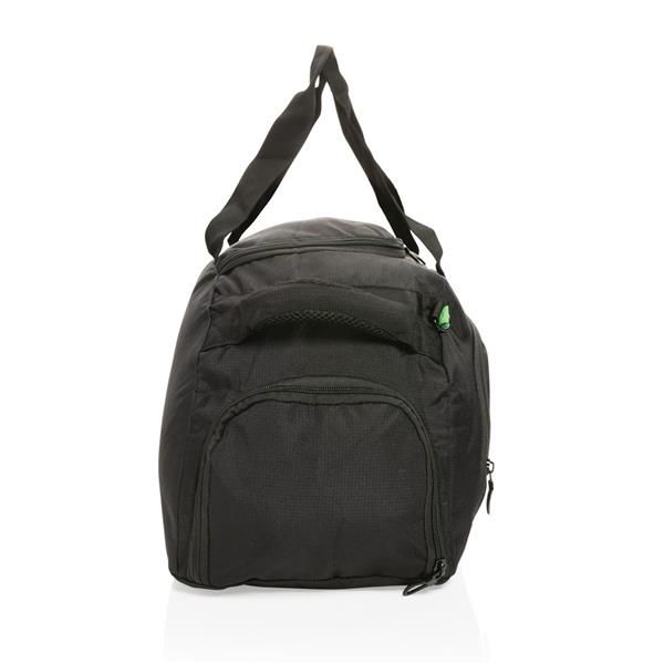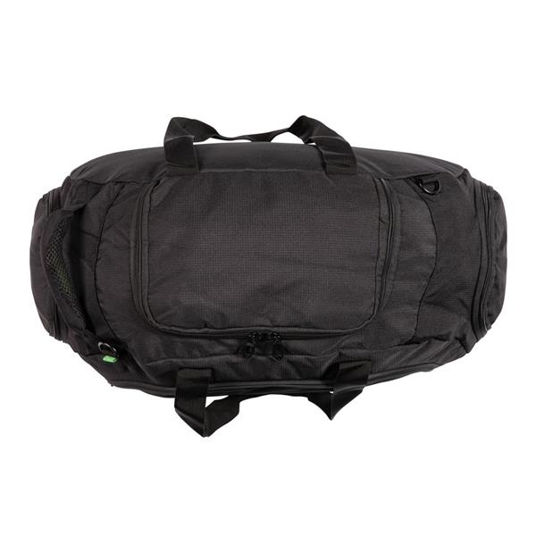 Torba sportowa, podróżna, wykonana z 600D ripstop, przednia kieszeń zamykana na zamek błyskawiczny z organizerem, kieszeń boczna, kieszeń na buty, pasek na ramię, uchwyty, 4 podpórki u podstawy, nie zawiera PVC, ślad węglowy produktu: 8,03 kg CO2