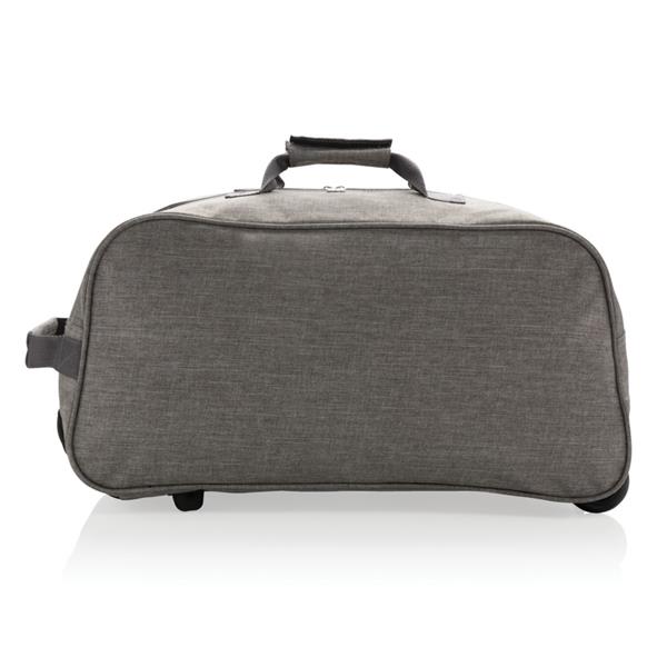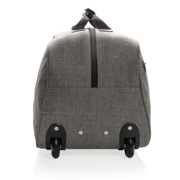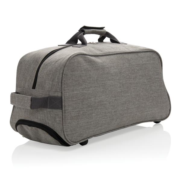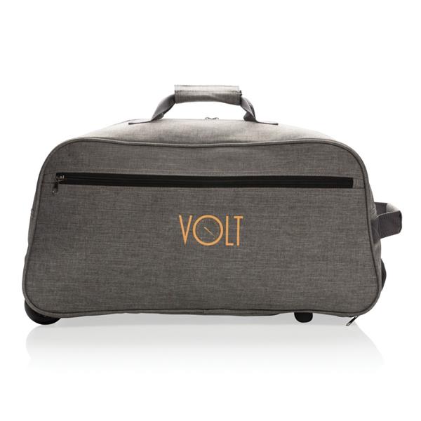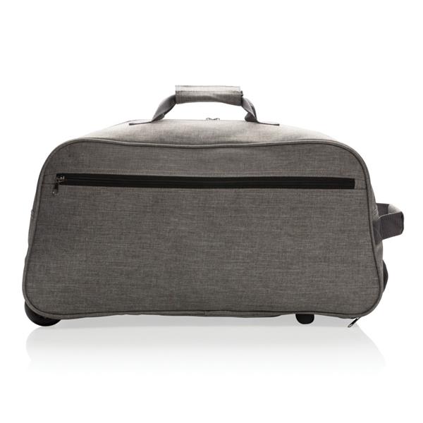 Torba sportowa, podróżna na kółkach, wykonana z dwukolorowego poliestru 600D o dużej gęstości, posiada przednią kieszeń, przegroda główna na zamek błyskawiczny, ślad węglowy produktu: 7,83 kg CO2
