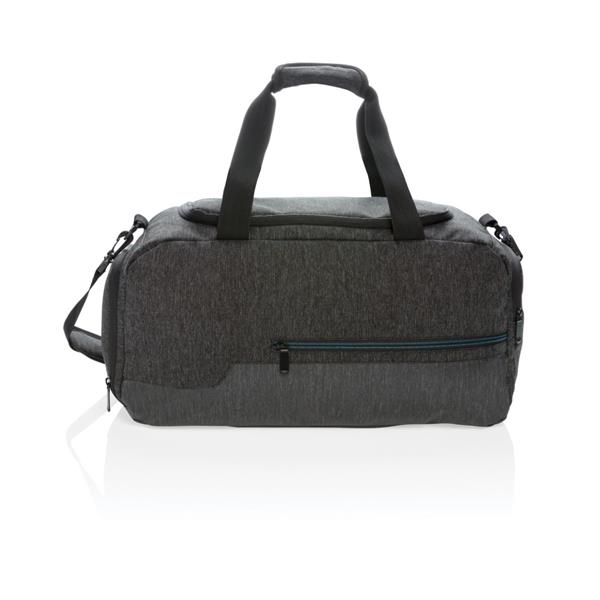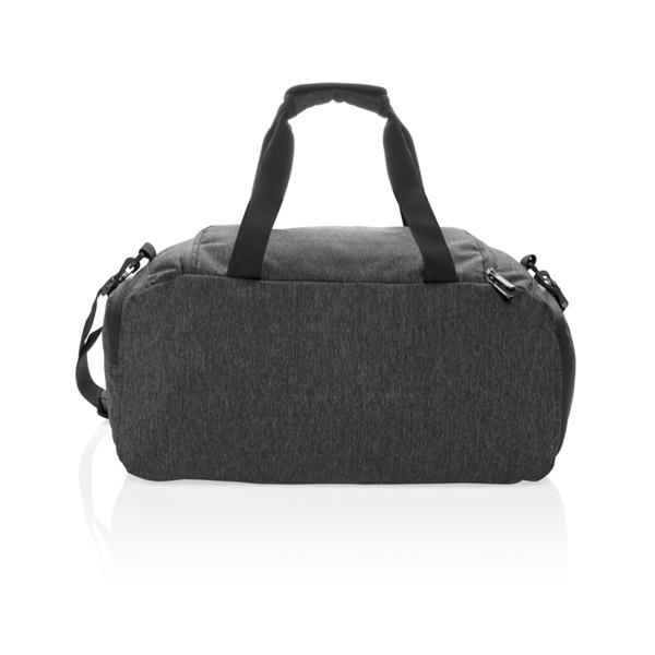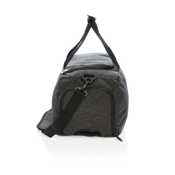 Torba sportowa, podróżna, wykonana z wytrzymałego poliestru 900D, wodoodporna powłoka na zewnątrz, wzmocnione uchwyty, miękki pasek na ramię, możliwość noszenia na różne sposoby, przestronna przegroda główna z wewnętrzną kieszenią na zamek do przechowywania pieniędzy lub innych wartościowych przedmiotów, oddychająca kieszeń na buty, przednia kieszeń na zamek, nie zawiera PVC, ślad węglowy produktu: 5,27 kg CO2
