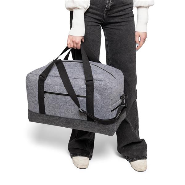 Torba sportowa, podróżna RPET, z płóciennymi uchwytami do przenoszenia i regulowanym paskiem na ramię, posiada dużą komorę zapinaną na zamek, mała kieszeń na zamek z przodu, ikona RPET na metce, pojemność: 30L, maksymalne obciążenie: 10 kg, produkt wykonany z filcu RPET