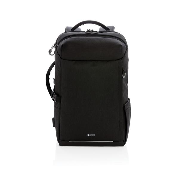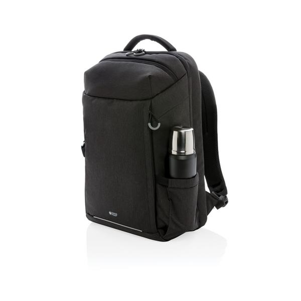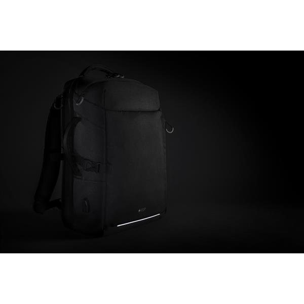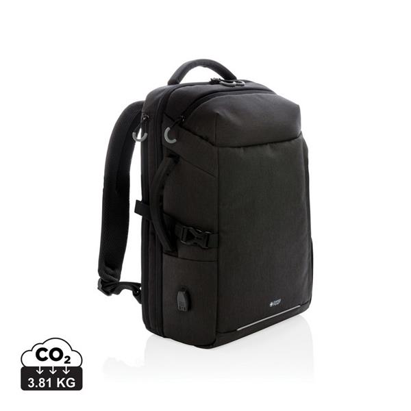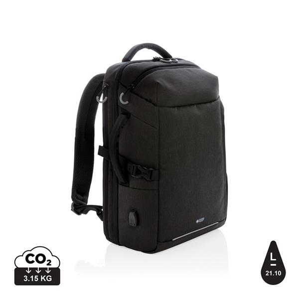 Plecak na laptopa 17″, wyściełana przegroda na laptopa, kieszeń z boku, kieszeń szybkiego dostępu na górze, kieszenie z ochroną RFID, wyjście USB do ładowania (power-bank nie jest dołączony), wykonany z RPET, posiada wbudowany znacznik AWARE™, który potwierdza wykorzystanie materiałów z recyklingu, dzięki wykorzystaniu materiałów z recyklingu przy produkcji tej torby udało się zaoszczędzić 21l wody, 2% wpływów z każdego sprzedanego produktu z kolekcji Impact jest przekazywane na rzecz Water.org