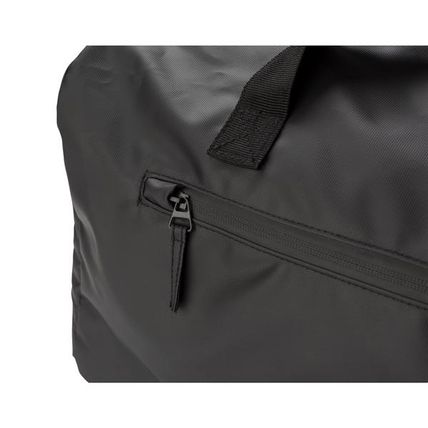 Wodoodporna torba podróżna, wykonana z poliestru, ze wzmocnionym dnem, kieszenie zamykane na zamek błyskawiczny, kieszeń na buty, kieszenie po obu stronach, pasek na ramię, uchwyty,