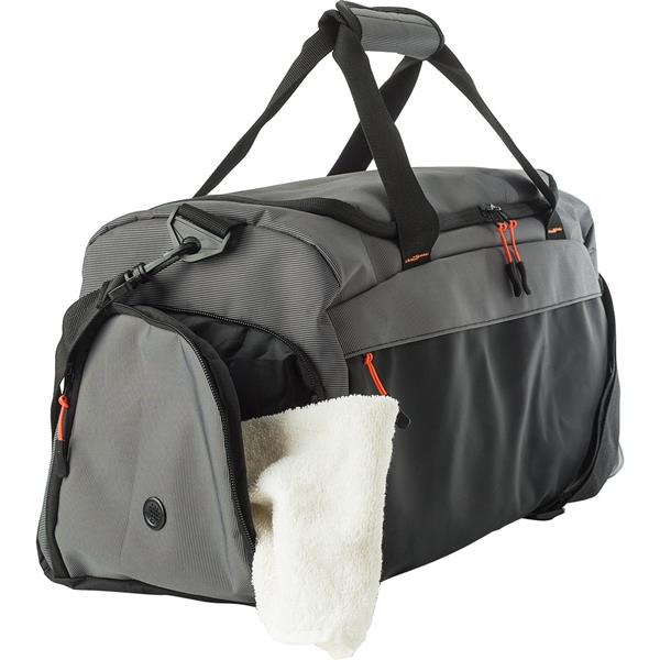 Torba sportowa, podróżna z kieszenią z przodu zapinaną na zamek, boczna kieszeń na buty zapewniająca dopływ powietrza, boczna kieszeń z siatki, krótkie ramiona z zapięciem na rzepy, przestronna przegroda wzmocniona na dole