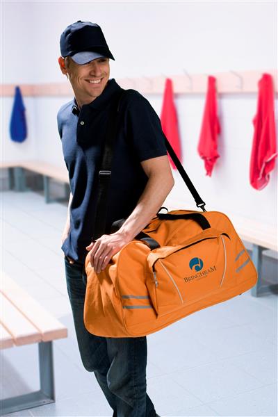 Torba sportowa, podróżna z dużą kieszenią przednią i połyskliwymi paskami, regulowany pasek na ramię