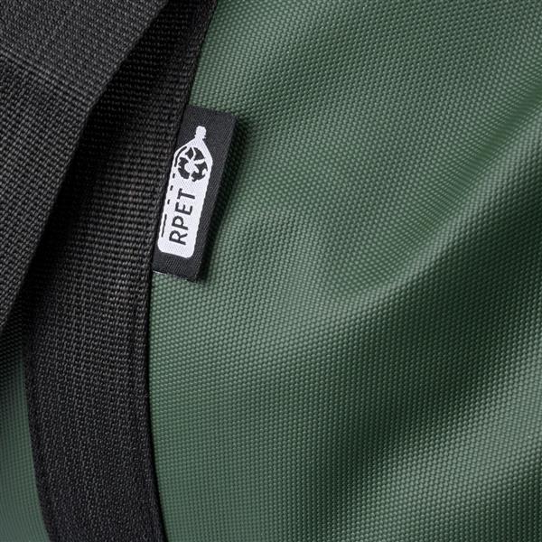 Torba sportowa, podróżna o pojemności 40 litrów, podszewka z poliestru 210D, powłoka wodoodporna, główna kieszeń zapinana na zamek, mała przednia kieszeń zapinana na zamek, kieszeń boczna zapinana na zamek, kieszeń boczna z siatką, dwa uchwyty do noszenia, posiada długi pasek umożliwiający noszenie na ramieniu, ikona RPET na metce, produkt wykonany z RPET 600D i PU