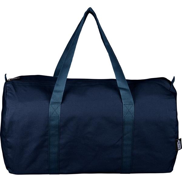 Torba sportowa, podróżna, 330 g/m2 o pojemności ok. 30 litrów, podszewka z poliestru 210 D, duża kieszeń zapinana na zamek z wierzchu, posiada długie uchwyty umożliwiające noszenie na ramieniu (100 x 3 cm), ikona RPET na metce, produkt wykonany z polibawełny z recyklingu, poliestru i RPET