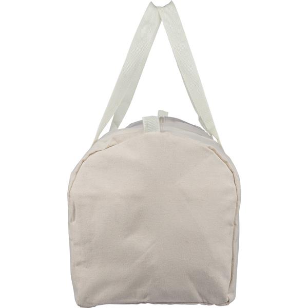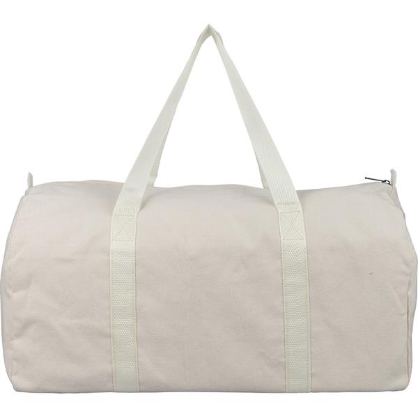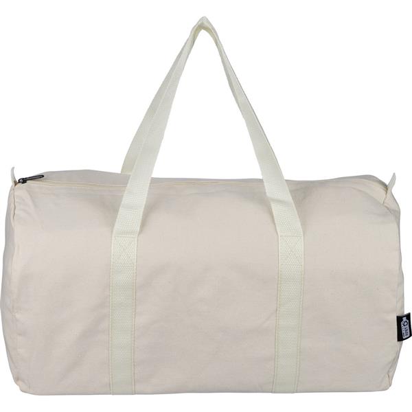 Torba sportowa, podróżna, 330 g/m2 o pojemności ok. 30 litrów, podszewka z poliestru 210 D, duża kieszeń zapinana na zamek z wierzchu, posiada długie uchwyty umożliwiające noszenie na ramieniu (100 x 3 cm), ikona RPET na metce, produkt wykonany z polibawełny z recyklingu, poliestru i RPET