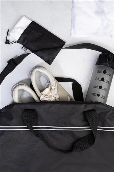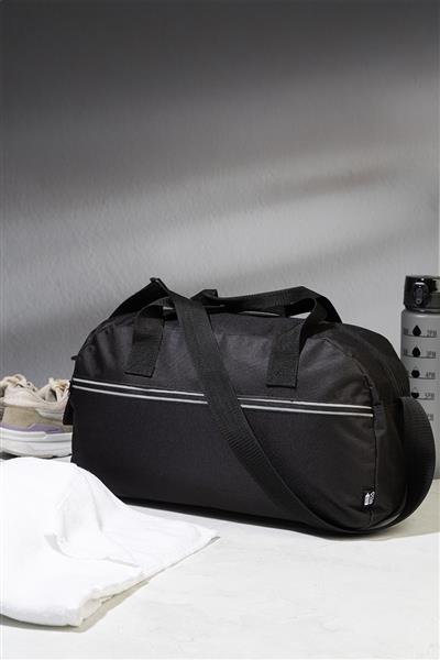 Torba sportowa RPET z główną komorą zapinaną na zamek, przednią kieszenią zapinaną na zamek z odblaskowymi paskami i regulowanym paskiem na ramię. Poliester RPET 600D, z charakterystyczną metką RPET.