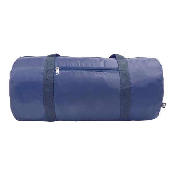 Torba sportowa RPET z główną komorą zapinaną na zamek, przednią kieszenią zapinaną na zamek i długimi uchwytami. Poliester RPET 190T z charakterystyczną metką RPET.