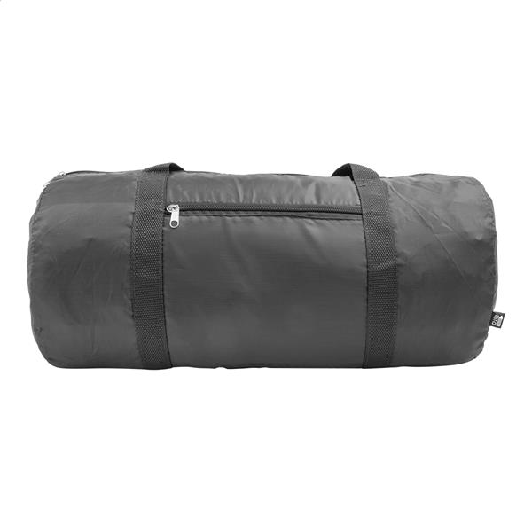 Torba sportowa RPET z główną komorą zapinaną na zamek, przednią kieszenią zapinaną na zamek i długimi uchwytami. Poliester RPET 190T z charakterystyczną metką RPET.
