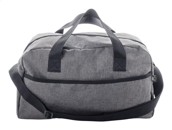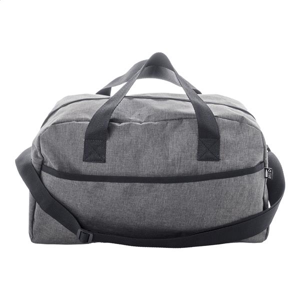 Torba sportowa RPET z kieszenią przednią, komorą główną zapinaną na zamek i regulowanym paskiem na ramię. Poliester 600D RPET z charakterystyczną metką RPET.