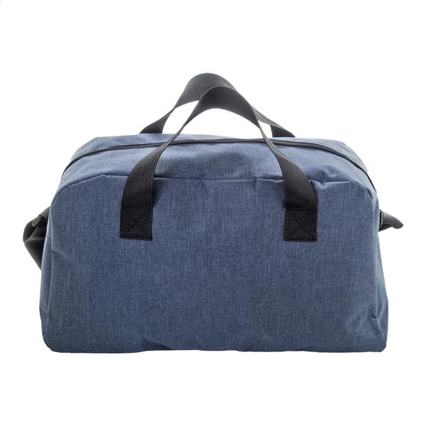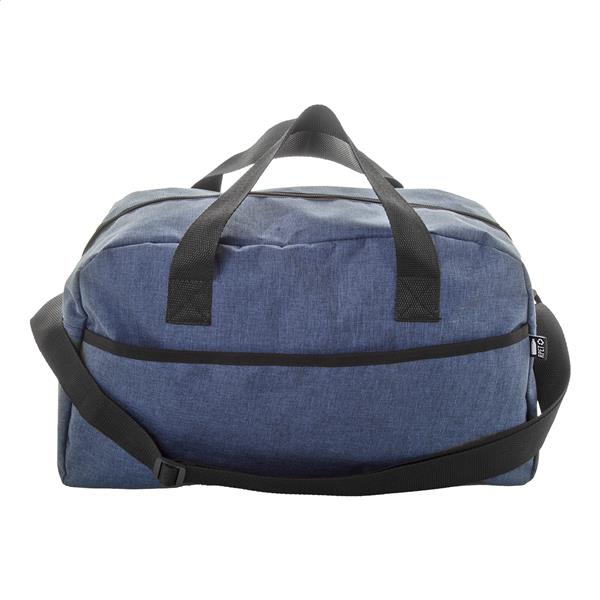 Torba sportowa RPET z kieszenią przednią, komorą główną zapinaną na zamek i regulowanym paskiem na ramię. Poliester 600D RPET z charakterystyczną metką RPET.