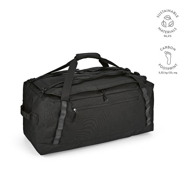 Idealna dla osób prowadzących aktywny tryb życia torba na siłownię 2w1 rPET o pojemności 75 l. Może być używana jako torba na siłownię lub jako plecak, ponieważ ma regulowane wyściełane paski. Odblaskowe czarne paski dla bezpieczeństwa. Przednie i wewnętrzne kieszenie zapewniają porządek.