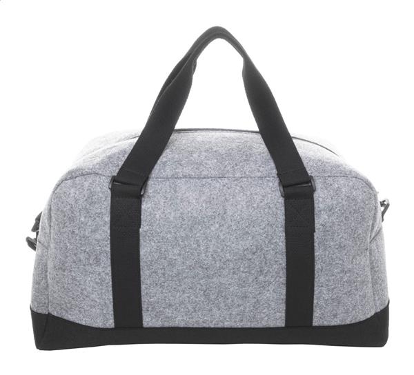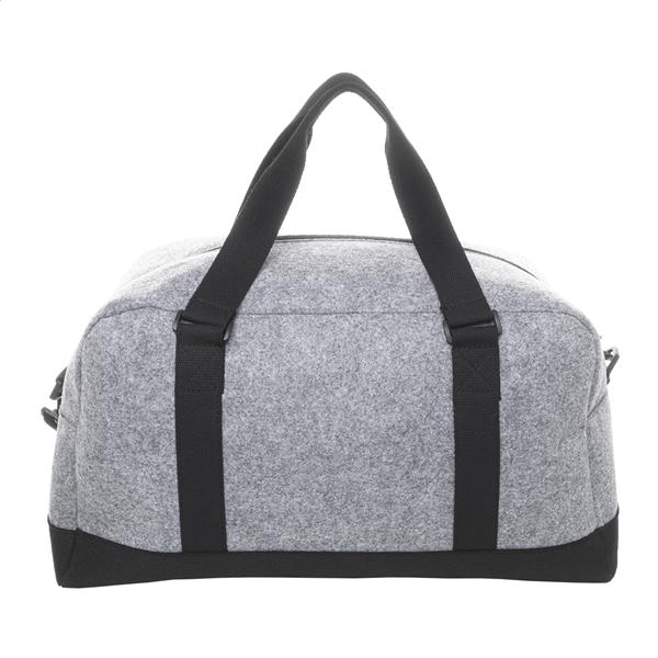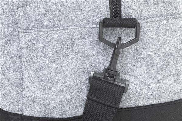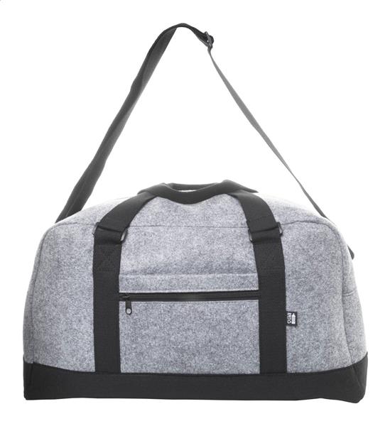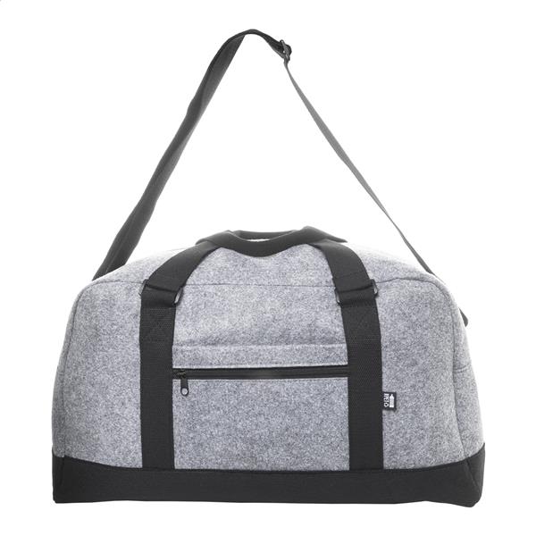 Dwukolorowa torba sportowa z filcu RPET z główną kieszenią oraz przednią kieszenią zapinaną na suwak i paskiem na ramię. Z charakterystyczną metką RPET.