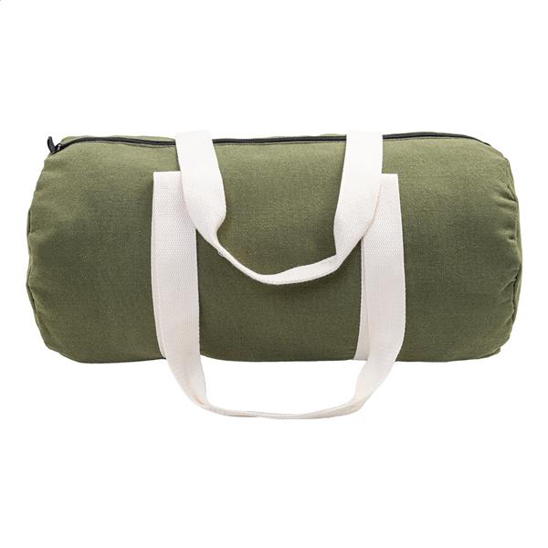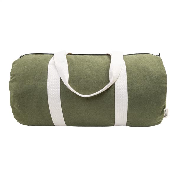 Torba sportowa z płótna z recyklingu z główną komorą zapinaną na zamek, wewnętrzną kieszenią zapinaną na zamek i długimi uchwytami. 70% bawełny z recyklingu i 30% poliestru z recyklingu. Z charakterystyczną metką z bawełny z recyklingu.