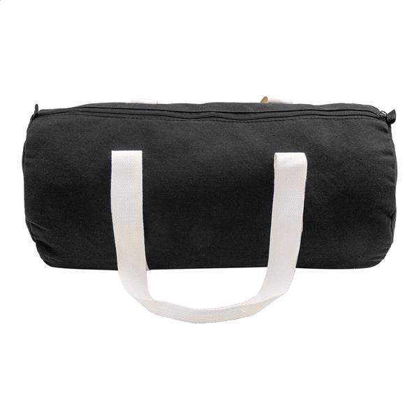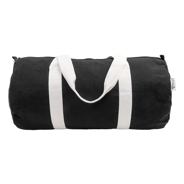 Torba sportowa z płótna z recyklingu z główną komorą zapinaną na zamek, wewnętrzną kieszenią zapinaną na zamek i długimi uchwytami. 70% bawełny z recyklingu i 30% poliestru z recyklingu. Z charakterystyczną metką z bawełny z recyklingu.