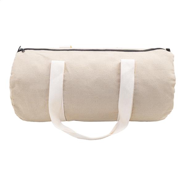Torba sportowa z płótna z recyklingu z główną komorą zapinaną na zamek, wewnętrzną kieszenią zapinaną na zamek i długimi uchwytami. 70% bawełny z recyklingu i 30% poliestru z recyklingu. Z charakterystyczną metką z bawełny z recyklingu.