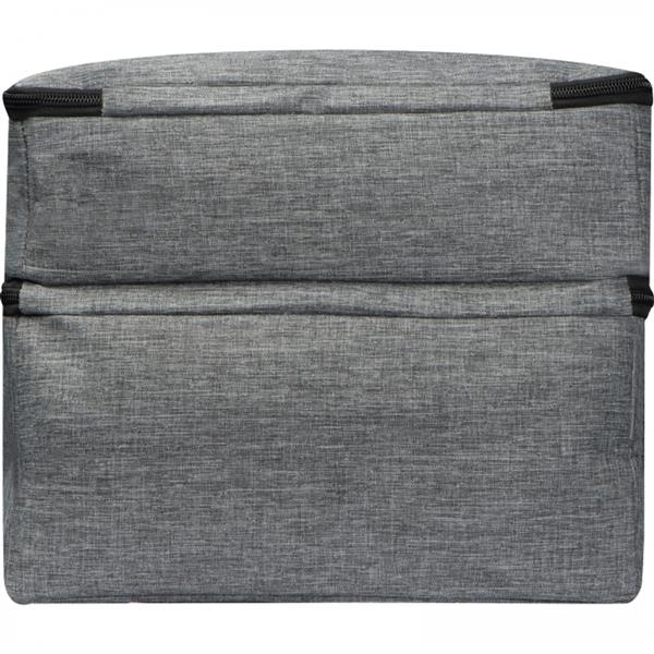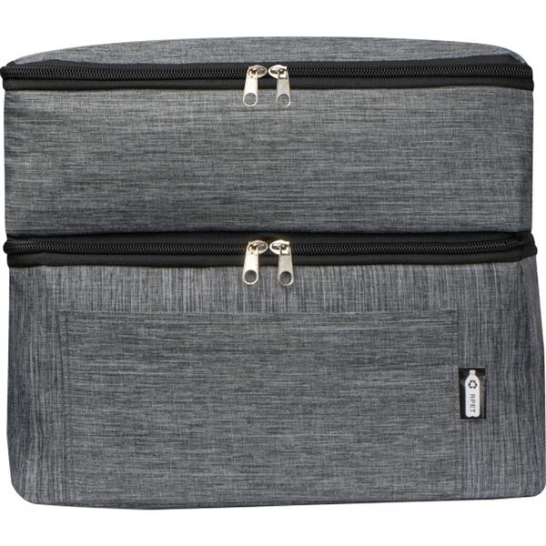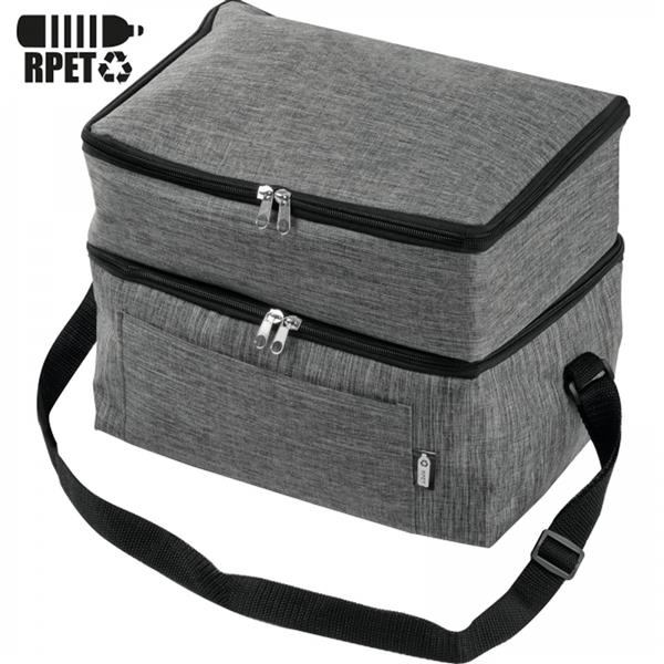 Torba termiczna wykonana z materiału RPET z dwoma chłodzącymi komorami i fronotwą kieszonką zamykaną na zamek. Torba została wyposażona w długi, regulowany pasek na ramie, ułatwiający przenoszenie.