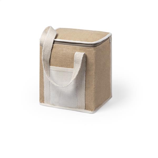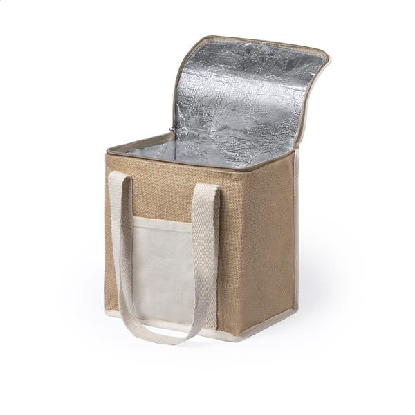 Zapinana na zamek torba termoizolacyjna z laminowanej juty i bawełny z aluminiową wyściółką. Z przednią kieszenią z bawełny idealnej do nadruku.