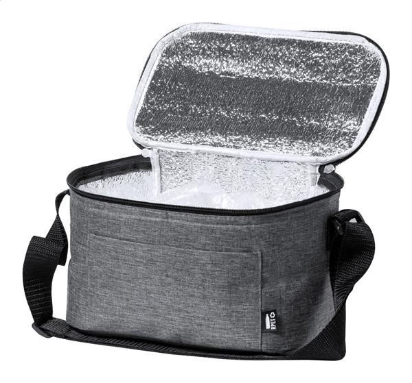 Zapinana na zamek torba termoizolacyjna z RPET z aluminiowym wypełnieniem, na 6 sztuk puszek 0,33 L. Z przednią kieszenią i regulowanym paskiem na ramię. Poliester 600D RPET z charakterystyczną metką RPET.