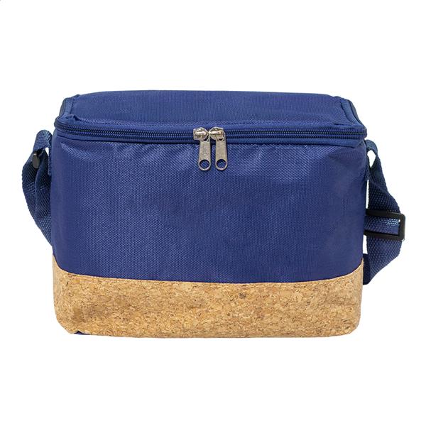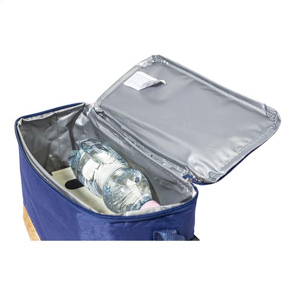 Torba termiczna z poliestru 600D RPET, zapinana na zamek, z podstawą z naturalnego korka, wyściółką PEVA i regulowanym paskiem na ramię. Z charakterystyczną metką RPET.