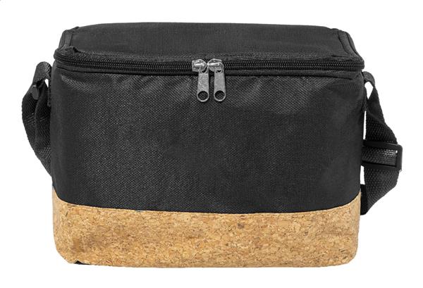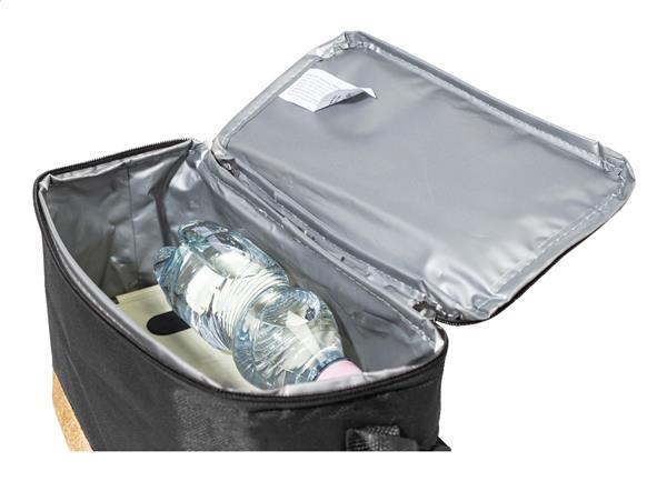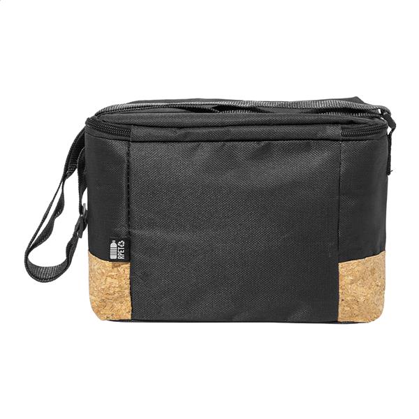 Torba termiczna z poliestru 600D RPET, zapinana na zamek, z podstawą z naturalnego korka, wyściółką PEVA i regulowanym paskiem na ramię. Z charakterystyczną metką RPET.