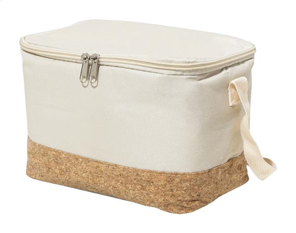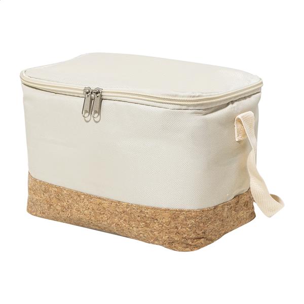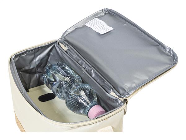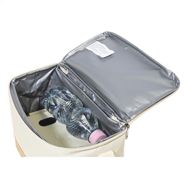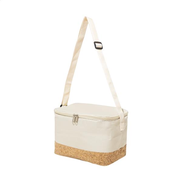 Torba termiczna z poliestru 600D RPET, zapinana na zamek, z podstawą z naturalnego korka, wyściółką PEVA i regulowanym paskiem na ramię. Z charakterystyczną metką RPET.