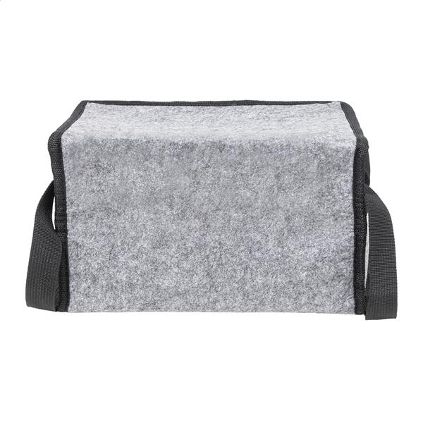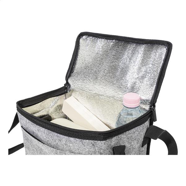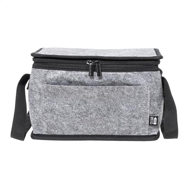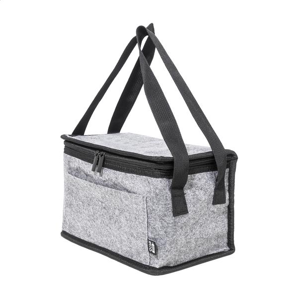 Zapinana na zamek torba termiczna z filcu RPET, z aluminiową wyściółką, kieszenią z przodu i uchwytami bocznymi. Z charakterystyczną metką RPET.