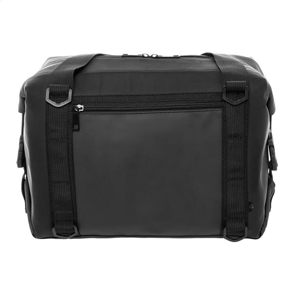 Zapinana na suwak, składana torba termoczna z miękkiej skóry PU z recyklingu z aluminiową wyściółką i kieszenią z przodu zapinaną na suwak. Z bocznymi klamrami, uchwytami i regulowanym paskiem na ramię. Torbę można złożyć na płasko, aby ułatwić przechowywanie, lub zabezpieczyć w kształcie za pomocą bocznych klamer podczas użytkowania.