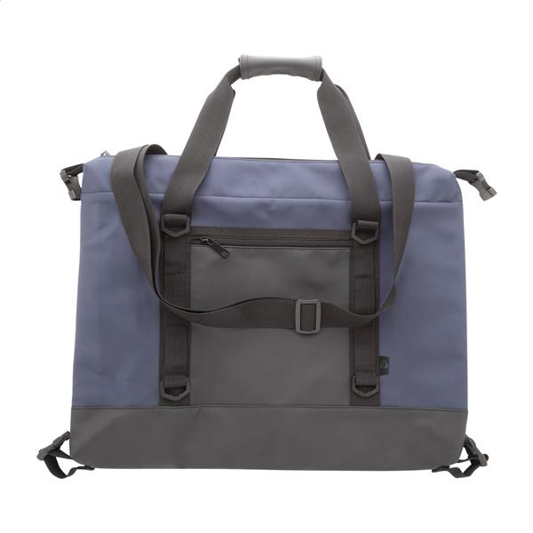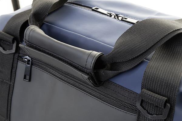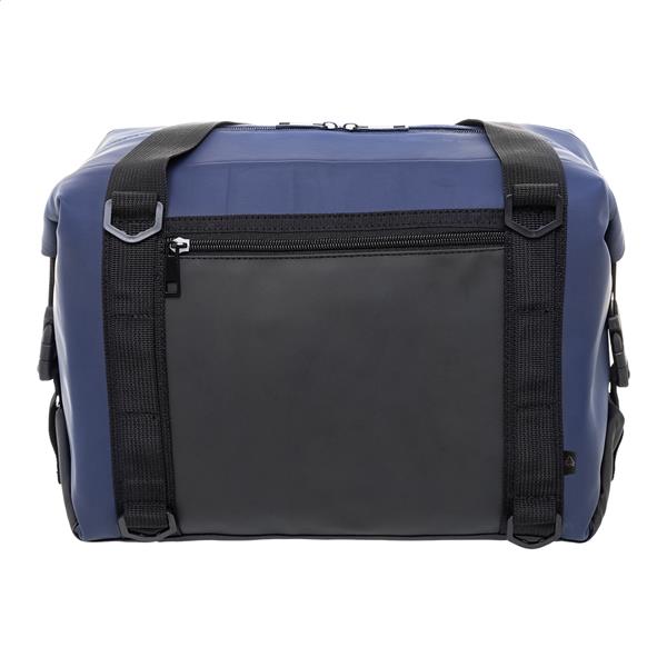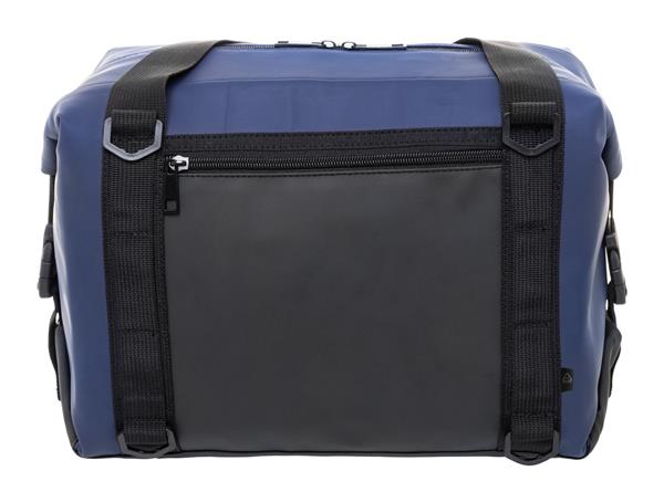 Zapinana na suwak, składana torba termoczna z miękkiej skóry PU z recyklingu z aluminiową wyściółką i kieszenią z przodu zapinaną na suwak. Z bocznymi klamrami, uchwytami i regulowanym paskiem na ramię. Torbę można złożyć na płasko, aby ułatwić przechowywanie, lub zabezpieczyć w kształcie za pomocą bocznych klamer podczas użytkowania.