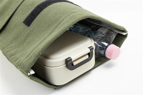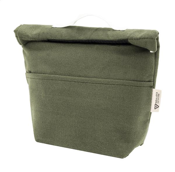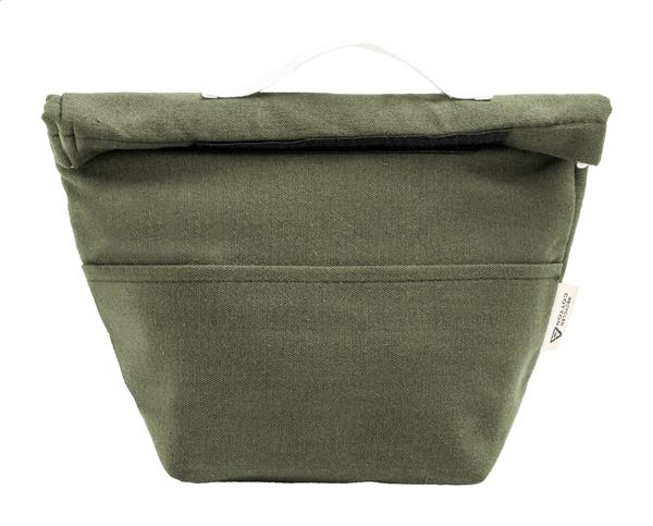 Torba termiczna z płótna z recyklingu z rolowaną klapą, kieszenią z przodu, aluminiową wyściółką i zapięciem na rzep. Wykonana w 70% z bawełny z recyklingu i w 30% z poliestru RPET. Z charakterystyczną metką z bawełny z recyklingu.
