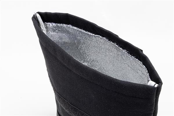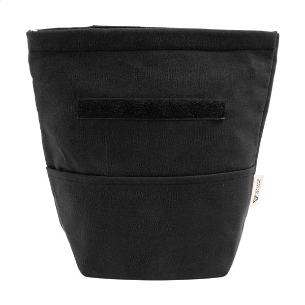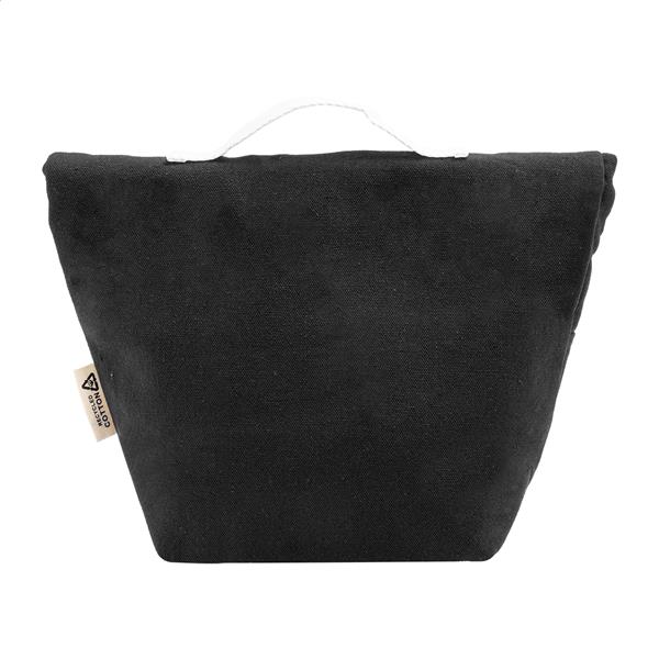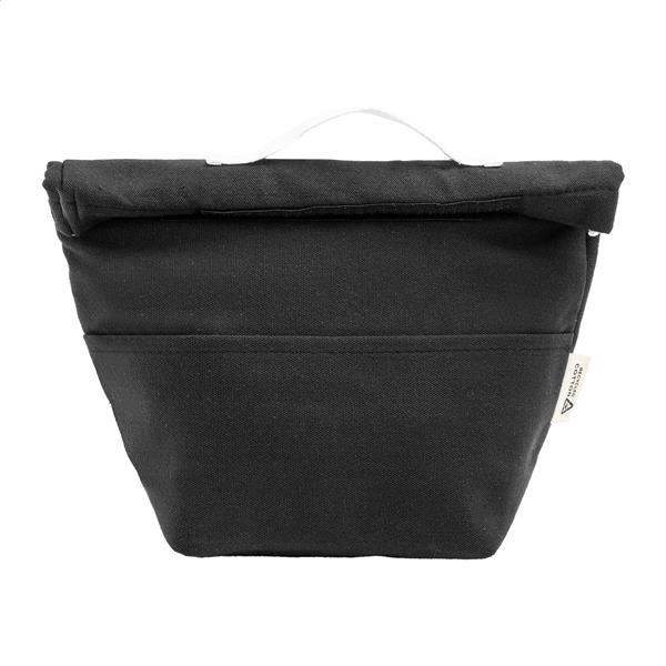 Torba termiczna z płótna z recyklingu z rolowaną klapą, kieszenią z przodu, aluminiową wyściółką i zapięciem na rzep. Wykonana w 70% z bawełny z recyklingu i w 30% z poliestru RPET. Z charakterystyczną metką z bawełny z recyklingu.