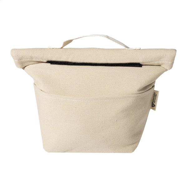 Torba termiczna z płótna z recyklingu z rolowaną klapą, kieszenią z przodu, aluminiową wyściółką i zapięciem na rzep. Wykonana w 70% z bawełny z recyklingu i w 30% z poliestru RPET. Z charakterystyczną metką z bawełny z recyklingu.