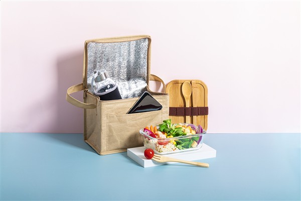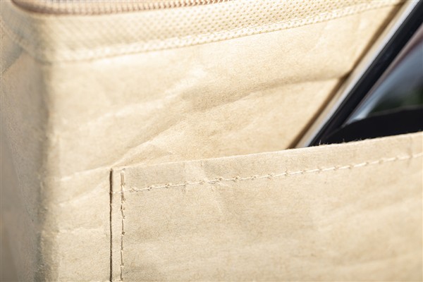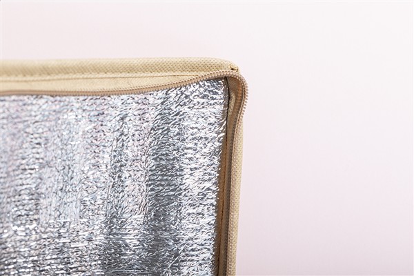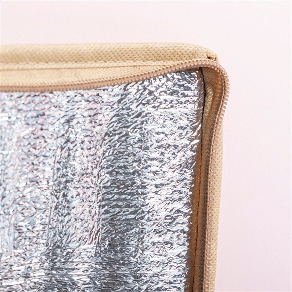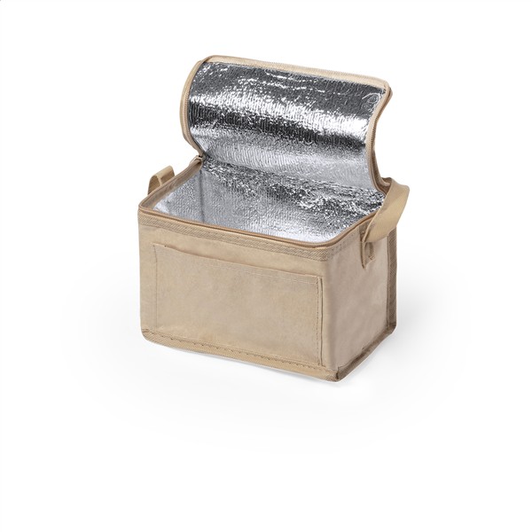Zapinana na zamek torba termoizolacyjna z laminowanego papieru makulaturowego z aluminiową wypełnieniem, na 6 puszek 0,33 l. Z przednią kieszenią pod nadruk.