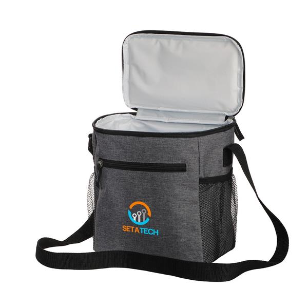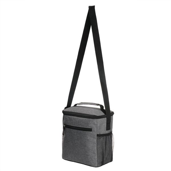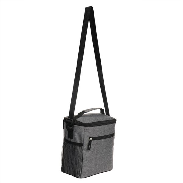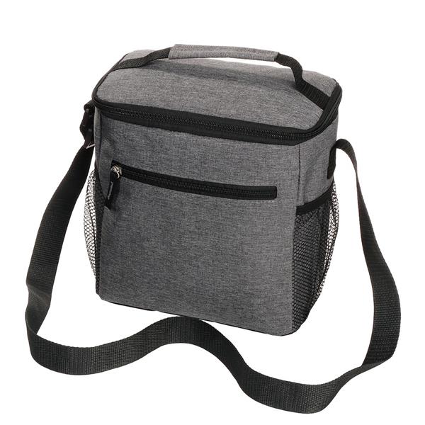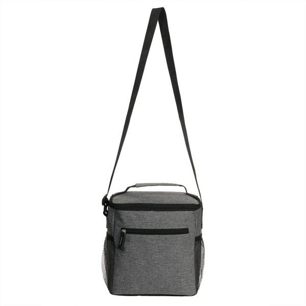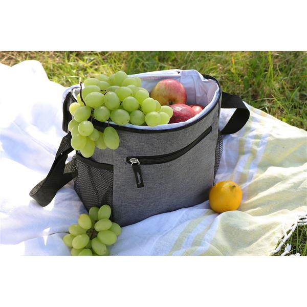 Torba termoizolacyjna, przegroda główna i przednia kieszeń zamykane na zamek błyskawiczny, 2 boczne kieszenie siateczkowe, uchwyt do noszenia oraz regulowany pasek na ramię