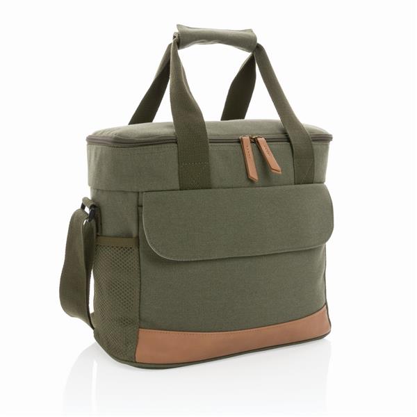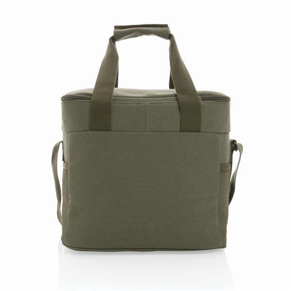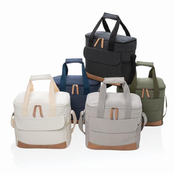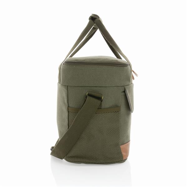 Torba termoizolacyjna, kieszeń z przodu oraz siateczkowe po bokach, pojemność torby do 20 puszek 0,33 l, detale z PU, wnętrze z PEVA, na zewnątrz płótno z recyklingu, dzięki zastosowaniu technologii śledzącej AWARE™ wykorzystane włókna są identyfikowalne z pochodzenia, 2% wpływów z każdego sprzedanego produktu z kolekcji Impact jest przekazywane na rzecz Water.org