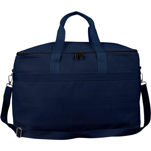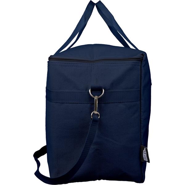 Torba termoizolacyjna 330 g/m2 o pojemności 23 l, dwa uchwyty do noszenia (3,5 x 60 cm), posiada regulowany uchwyt umożliwiający noszenie na ramieniu (2,5 x 110 cm), metalowa klamra, wnętrze wyłożone folią aluminiową, ikona RPET na metce, produkt wykonany z polibawełny z recyklingu, folii aluminiowej i RPET