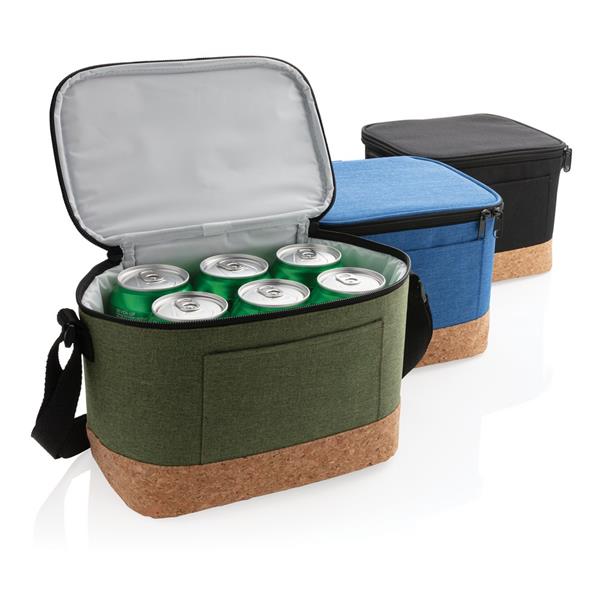 Torba termoizolacyjna, korkowe wykończenie, przegroda główna zamykana na zamek błyskawiczny, kieszeń z przodu, pojemność torby do 6 puszek 0,33 l, pasek na ramię w komplecie, ślad węglowy produktu: 1,67 kg CO2