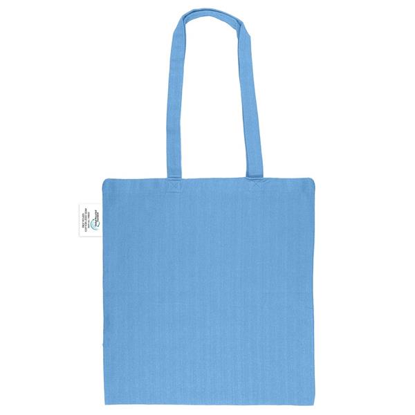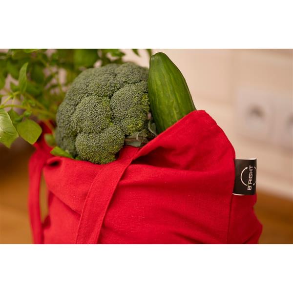 Torba na zakupy B’RIGHT, posiada długie uchwyty umożliwiające noszenie na ramieniu, produkt wykonany z bawełny z recyklingu o gramaturze 200 g/m2 i poliestru z recyklingu, zgodna z certyfikatem GRS (Global RecycIed Standard)