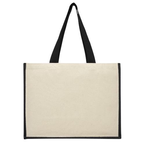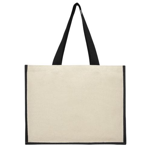 Modna torba na zakupy z panelami bocznymi z łatwego do nadrukowania płótna 320 g/m2 i wyjątkowych ramek z laminowanej juty, z uchwytami z bawełny.