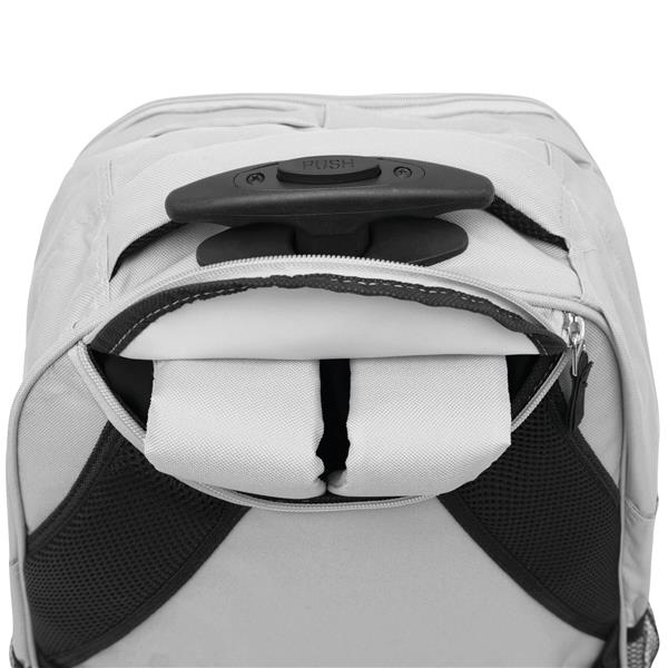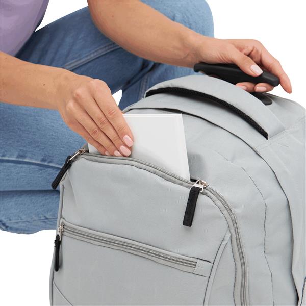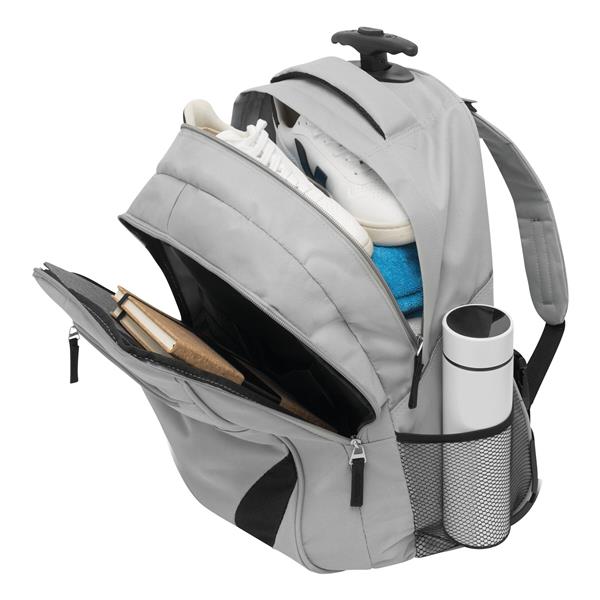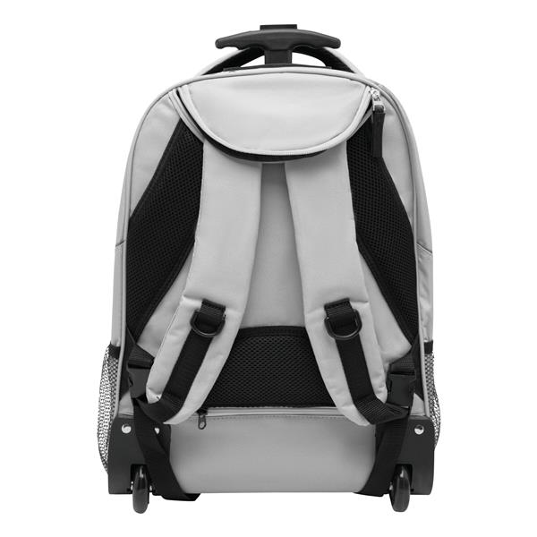Plecak na kółkach TRAILER. Mała przednia kieszonka na zamek, duża przednia kieszeń z organizerem na zamek, komora główna z wyściełaną kieszenią na laptopa na zamek, 2 kieszonki boczne z siatki, wyściełane plecy i ramiączka, kieszonka na zamek do chowania ramiączek. Z teleskopowym uchwytem, uchwytem do przenoszenia, 2 gładko jeżdżącymi kołami z materiałową osłoną.