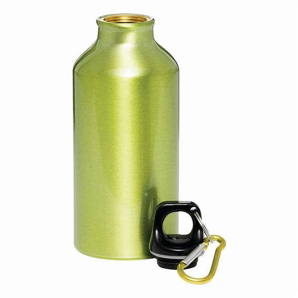 Aluminiowy bidon TRANSIT z dopasowanym kolorystycznie karabińczykiem i zamknięciem na plastikowy zatrzask. Pojemność ok. 400 ml.