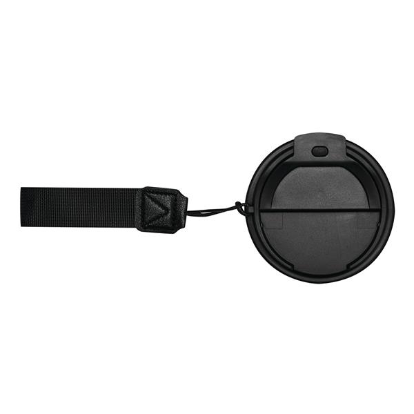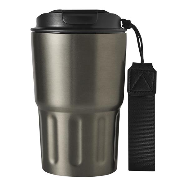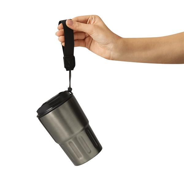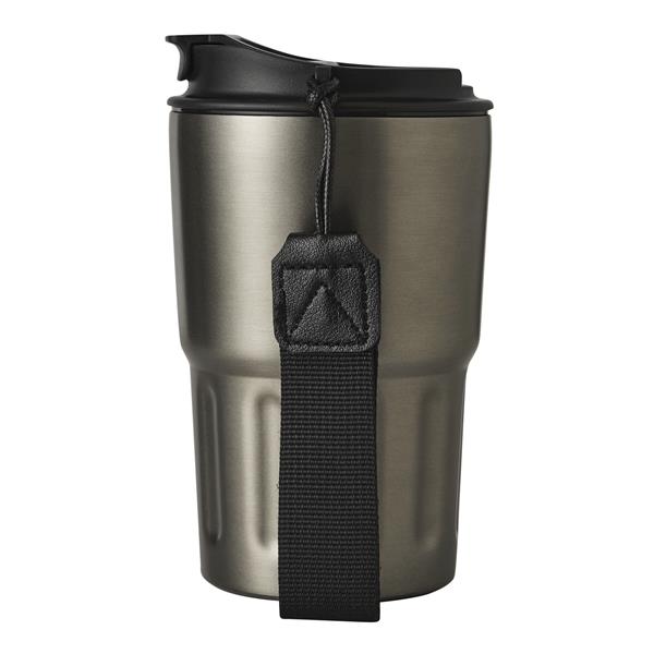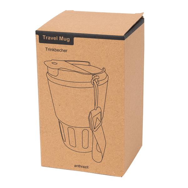Kubek termiczny TRAVEL MUG, z podwójną izolacją: wewnątrz i na zewnątrz wykonany jest ze stali nierdzewnej. Ma matową powłokę proszkową, plastikową pokrywkę z bezpieczną zakrętką, silikonową uszczelką i otworem do picia. Pojemność kubka to ok. 400 ml. Posiada pasek na nadgarstek wykonanym z tworzywa sztucznego pochodzącego z recyklingu.
