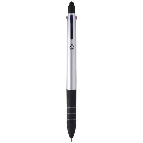 Długopis Trine 3 w 1 to uniwersalny przyrząd do pisania wykonany z certyfikowanego przez RCS tworzywa ABS z nowoczesnym metalicznym wykończeniem i wbudowaną końcówką rysika do obsługi ekranów dotykowych. Posiada mechanizm przesuwanego suwaka, który umożliwia łatwe przełączanie między czarnym, niebieskim i czerwonym tuszem. Ergonomiczny uchwyt z czarną gumą antypoślizgową i szarymi detalami w postaci pierścieni zapewnia wygodną obsługę. Długopis Trine jest kompaktowy, funkcjonalny i idealny do brandingu, a także doskonale nadaje się do robienia notatek, prezentacji lub interakcji cyfrowych.