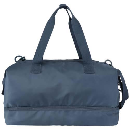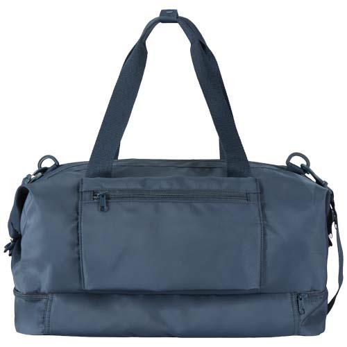 Torba podróżna Trip Aware™ wykonana z materiałów pochodzących z recyklingu to wszechstronny i pojemny towarzysz, idealny na krótkie wypady, w której z łatwością zmieścisz wszystkie niezbędne rzeczy. Wykonana z wytrzymałego poliestru 290D o splocie skośnym z miękkim dzianinowym spodem i podszewką RPET 210D/PU, jest praktyczna i wygodna. Główna komora zawiera dużą kieszeń zapinaną na suwak z miejscem na paszport, długopisy i wstążkę do kluczy, a także dwie wewnętrzne kieszenie wsuwane i dwa uchwyty na butelkę z wodą. Oddzielna dolna komora rozchyla się, co jest idealne do przechowywania butów lub oddzielnego sprzętu. Do każdej torby dołączona jest również zawieszka Aware™ pozwalająca użytkownikom prześledzić za pomocą kodu QR pochodzenie i ścieżkę produkcji, zwiększając przejrzystość łańcucha dostaw i wspierając silniejszy związek między produktem a jego procesem produkcyjnym. Pojemność: 42 litrów.