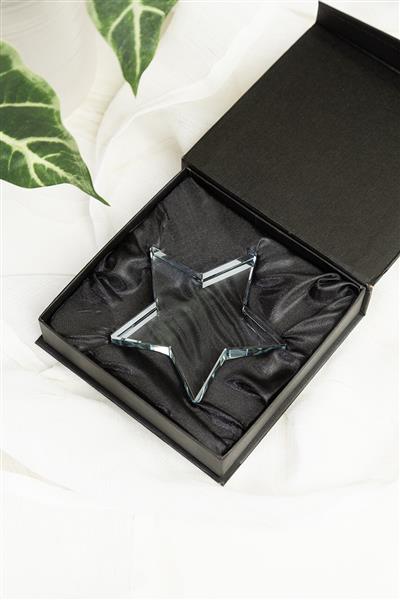 Szklane trofeum w kształcie gwiazdy, w czarnym pudełku prezentowym.